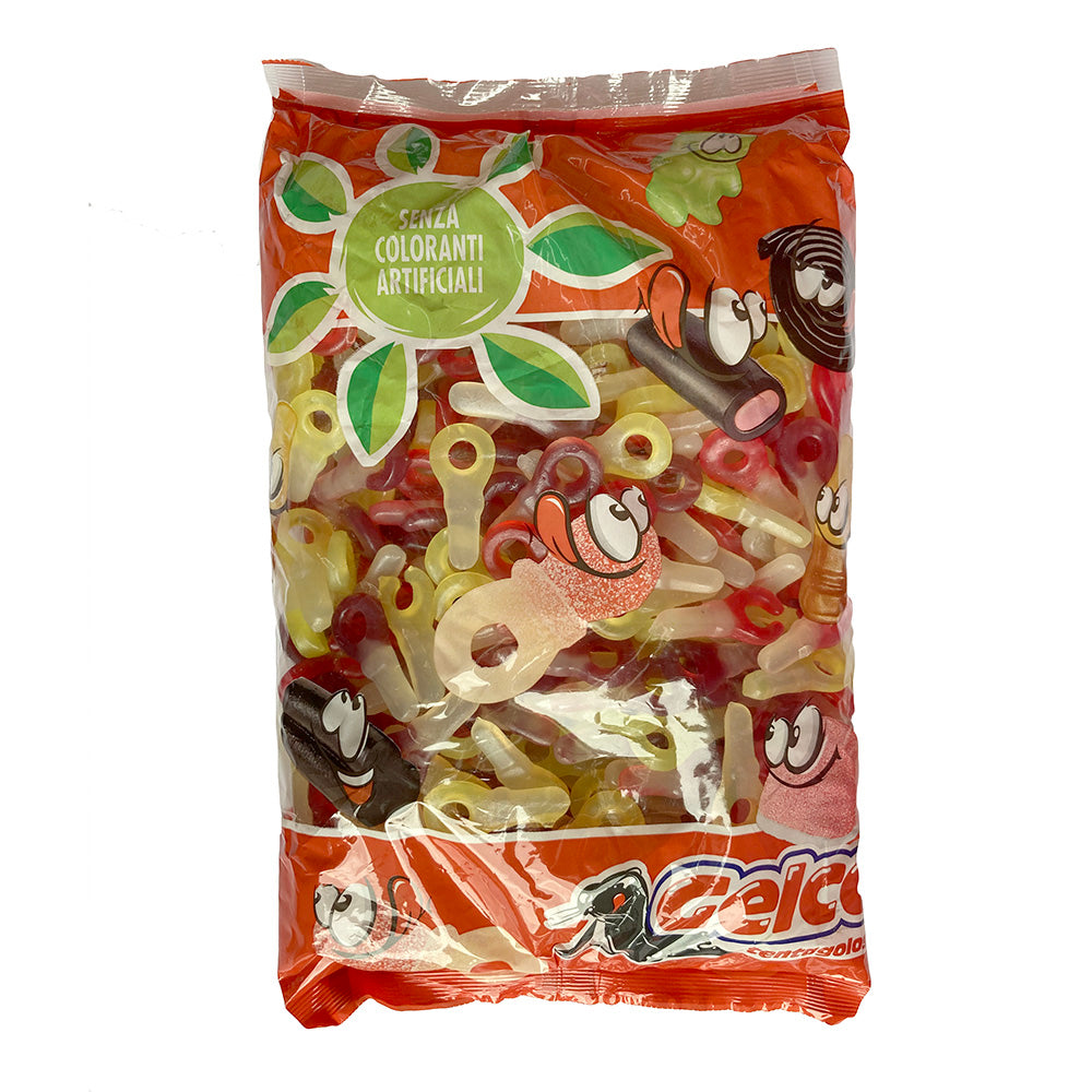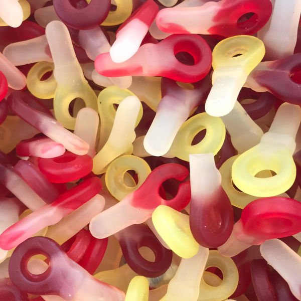 Caramelle gommose lucide a forma di ciucci e al gusto di frutta assortita.